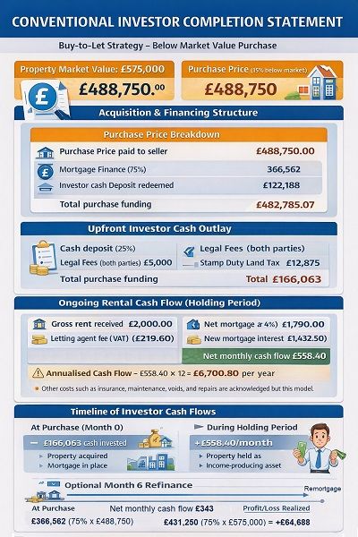 A Conventional Investor (COI) buys a house on the market at £575,000 for £488,750 (15% below market value).