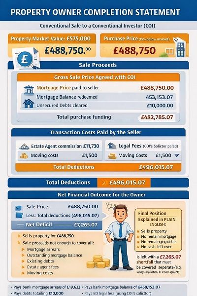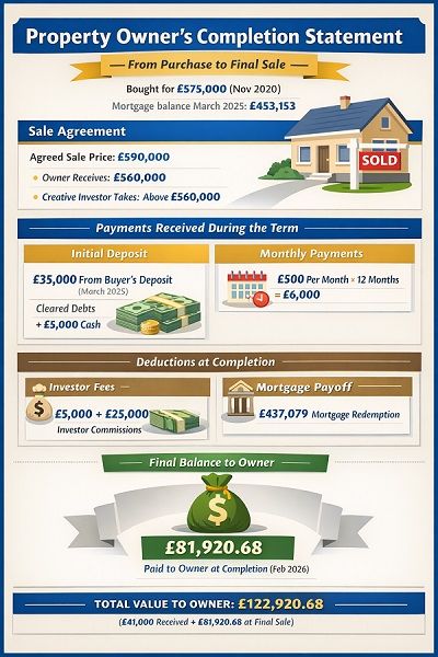 At the start of the arrangement: From that £40,000 deposit, £35,000 is paid to the seller upfront (used to clear £19,632 of mortgage arrears, £10,000 in unsecured debts and the balance £5,368 cash towards relocation expenses). The investor receives the balance of £5,000 upfront from the buyer’s deposit.