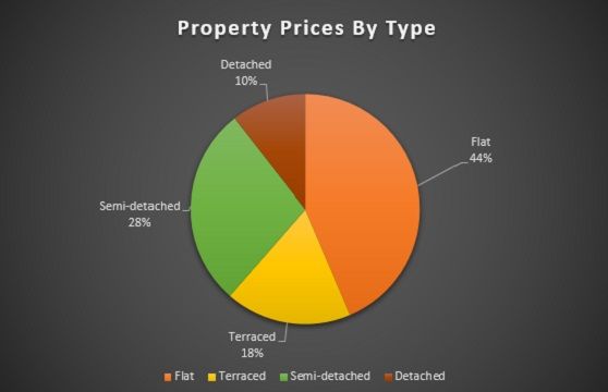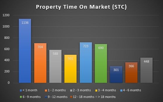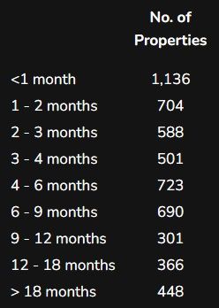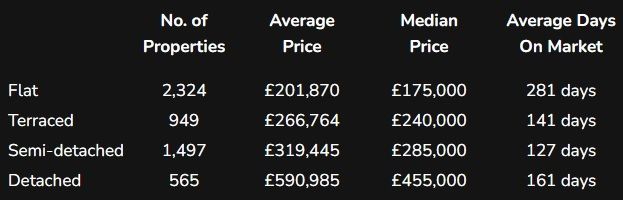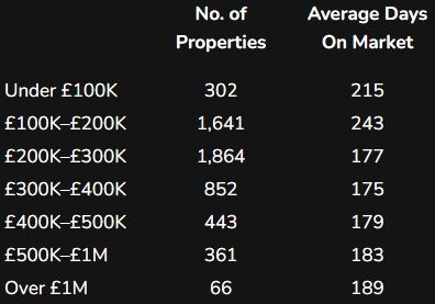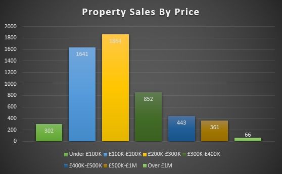 Competition for properties: Reviewing the chart and data above, the biggest cluster of sales activity falls between £100,000 and £300,000, but with average sales days similar to London — possibly due to the aggregation of sales chains from a large population. Noticeably, these three relevant bands between them make up 63.4% of all sales!