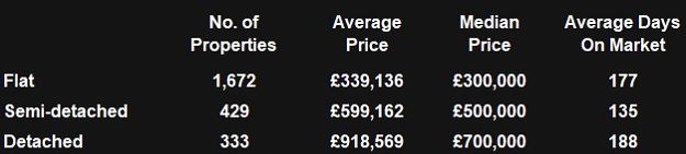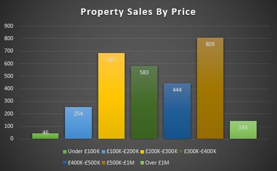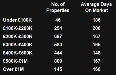 Competition for properties: Reviewing the chart and data above, most sales activity is widely and almost-evenly spread between £200,000 and £1,000,000, with average sales days similar across all bands.