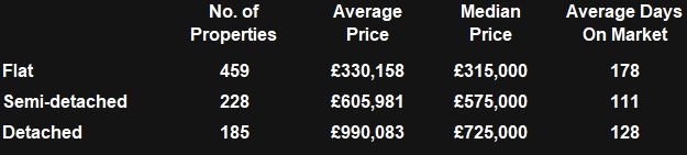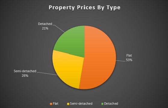Apart from the property price band between £500,000 and £1,000,000, Cambridge's property market shows more stable data across the 3 preceeding bands between £200,000 and £500,000. As you will discover further down, slightly less than half of all sales are from houses, with the balance being from flats.
