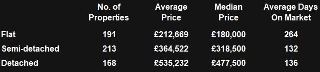 Competition for properties: Family houses, particularly semi-detached homes, continue to attract solid demand due to limited supply and long-term owner appeal. Terraced and semi-detached properties forming a significant share of listings, with average prices around the mid-£300,000s and relatively shorter average days on market compared to flats. Flats, by contrast, make up a meaningful portion of available stock but tend to remain on the market much longer — with average marketing periods exceeding eight months — reflecting weaker buyer demand and concerns around service charges and resale liquidity.